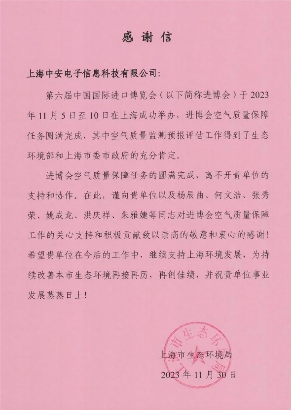 上海環(huán)監(jiān)中心就中安科技在21年國(guó)際進(jìn)博會(huì)空氣質(zhì)量監(jiān)測(cè)預(yù)報(bào)工作中杰出貢獻(xiàn)送來(lái)感謝信!(2021/12/31)